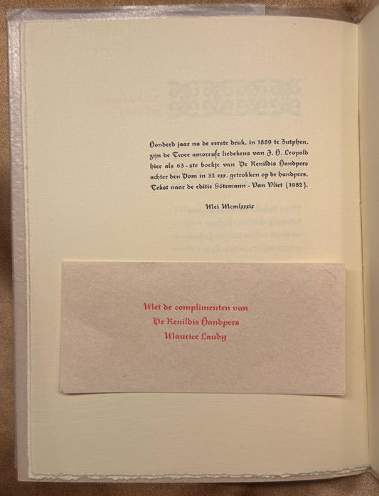 [Renildis Handpers]. Leopold, J.H. Twee amoreuse liedekens. Utrecht, Renildis Handpers, 1989.