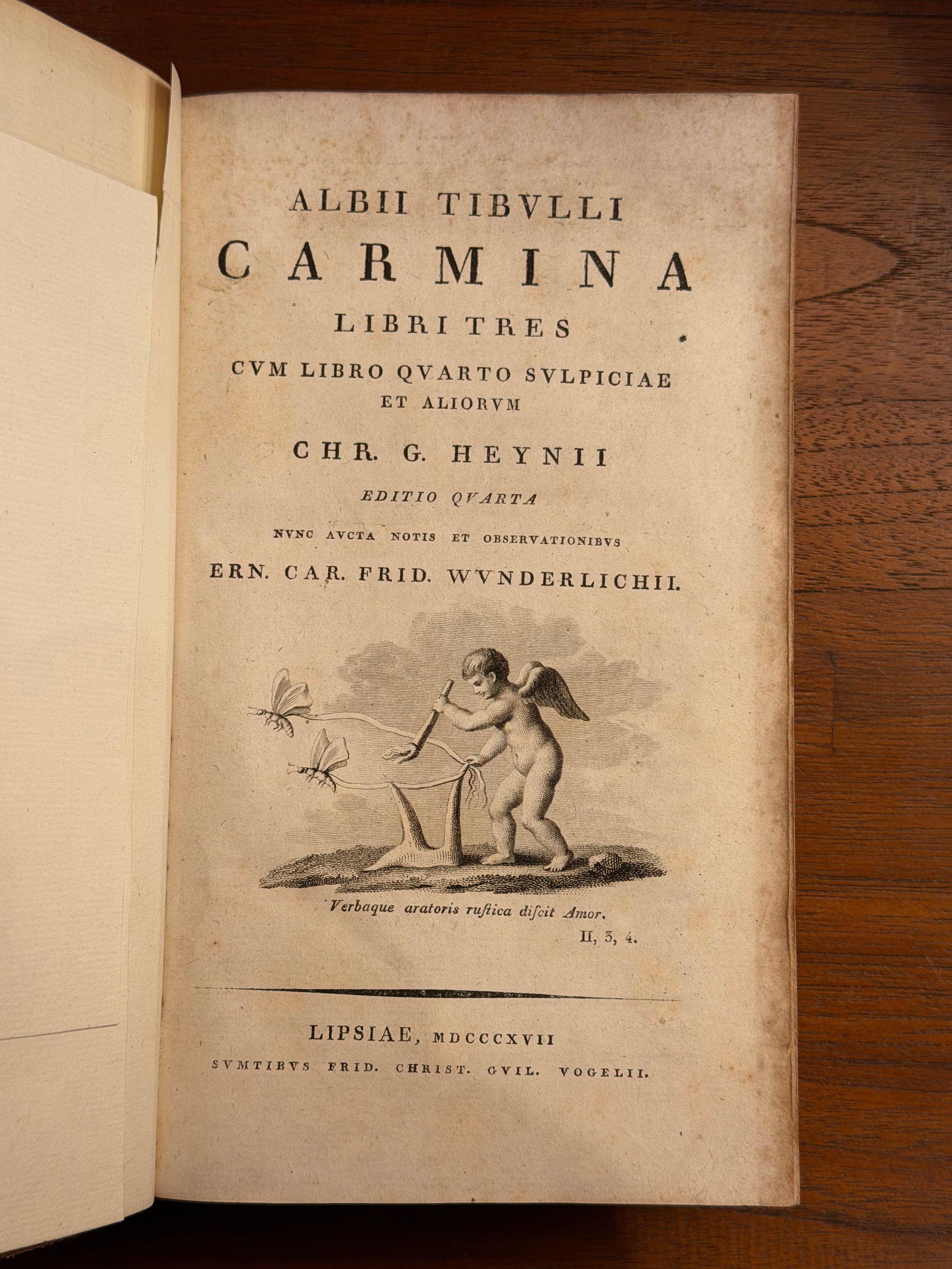 1. Albii Tibulli [Albius Tibullus] Carmina, libri Tres cum libro quarto sulpiciae et aliorum. 2. Observationes et indices in tibullum. Lipsiae [Leipzig], Frid. Christ. Guil. Vogelii, 1717,