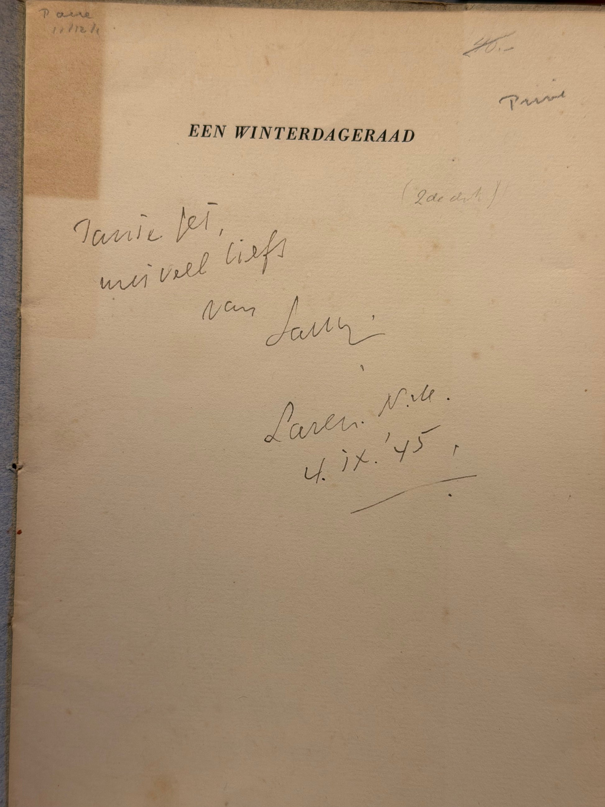 A. Roland Holst's "Een Winterdageraad" in paperback format, personally signed by the author with a heartfelt dedication inscribed to his aunt. This inscribed copy carries the intimate mark of the author's hand, making it a distinctive addition to any collection of Dutch literary works.