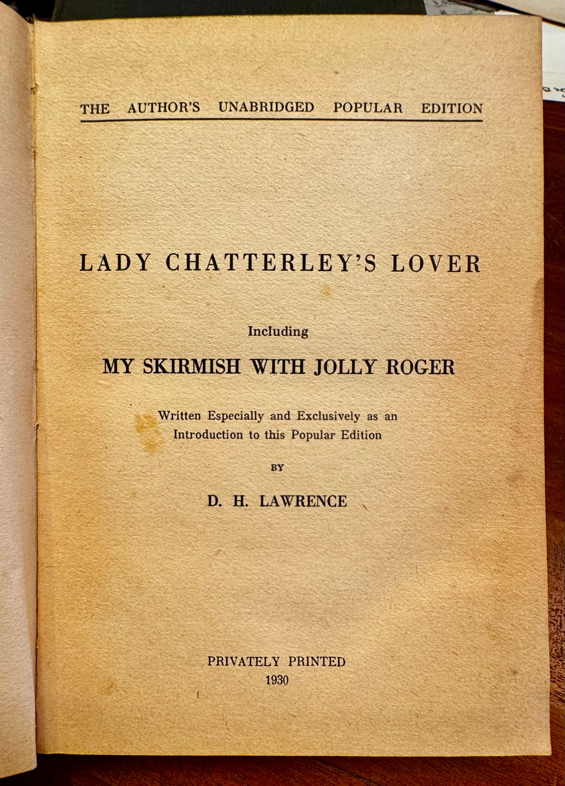 D.H. Lawrence, Lady Chatterley's lover including my skirmish with Jolly Roger. Privatly printed, 1930
