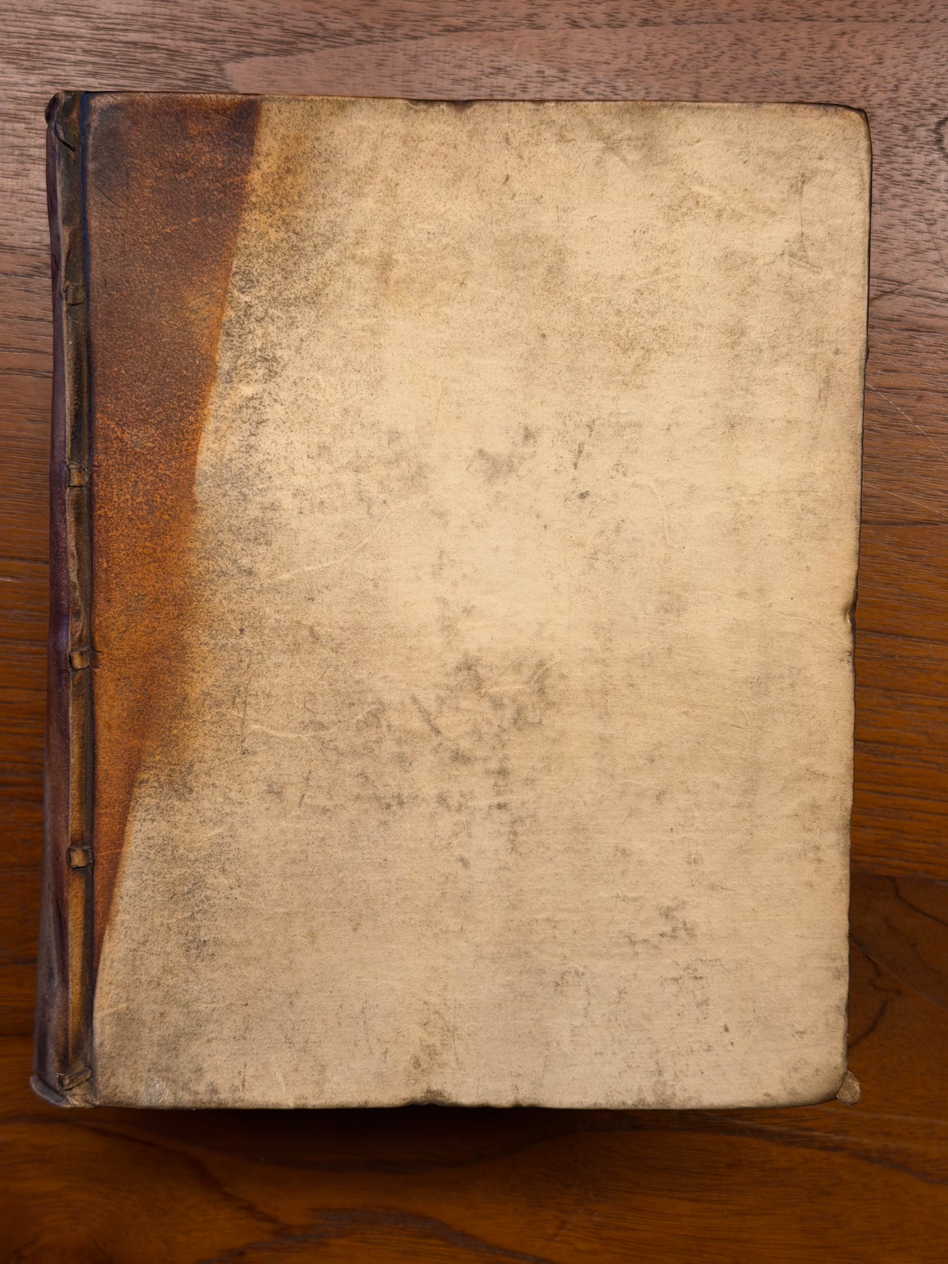 In twee delen, met titelplaat. In perkamenten band met wat verkleuring door rookschade, desondanks in goede staat.