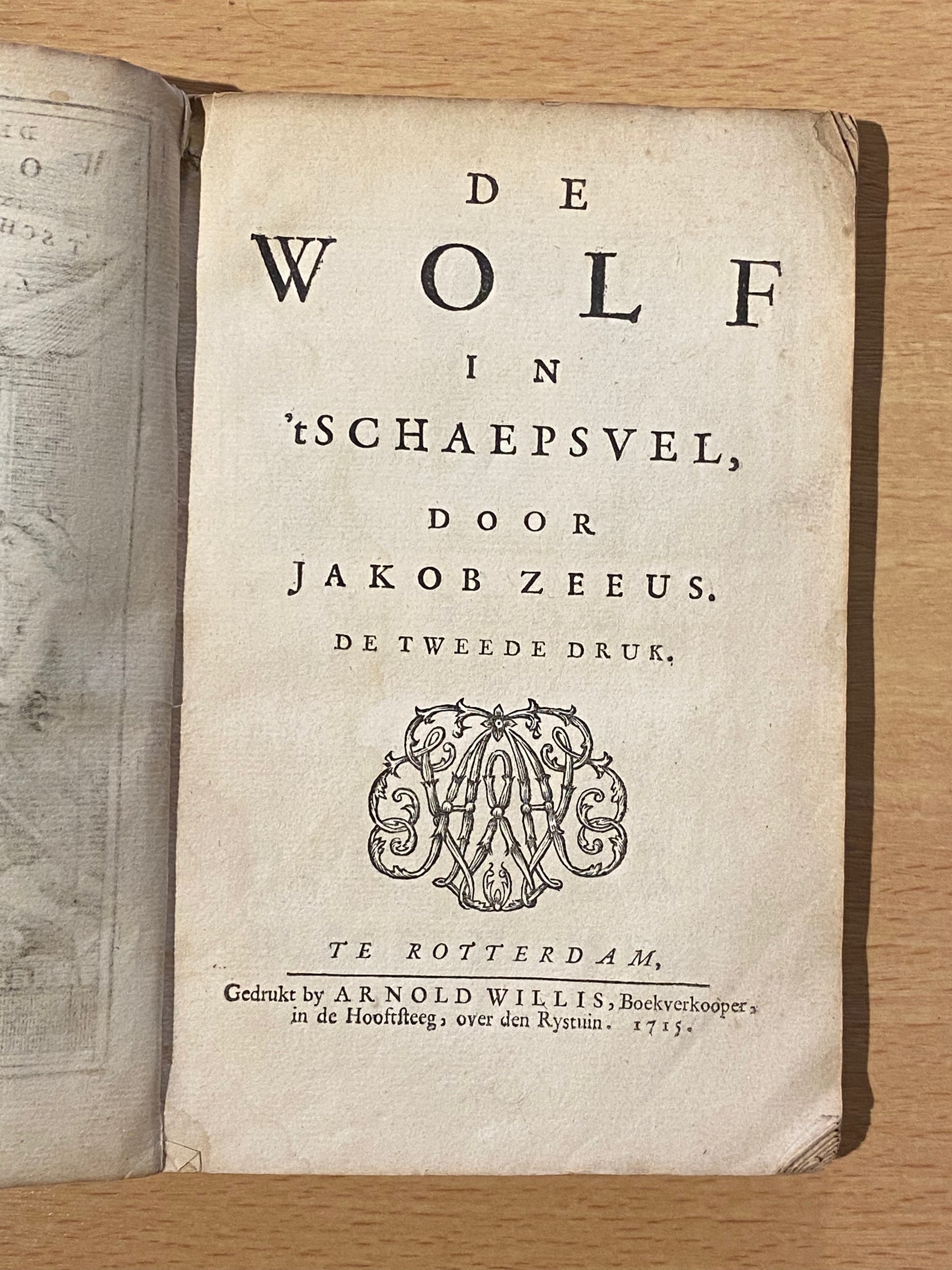 Jakob Zeeus. De wolf in 't schaepsvel. Tweede druk. Rotterdam, Arnold Willis, 1711