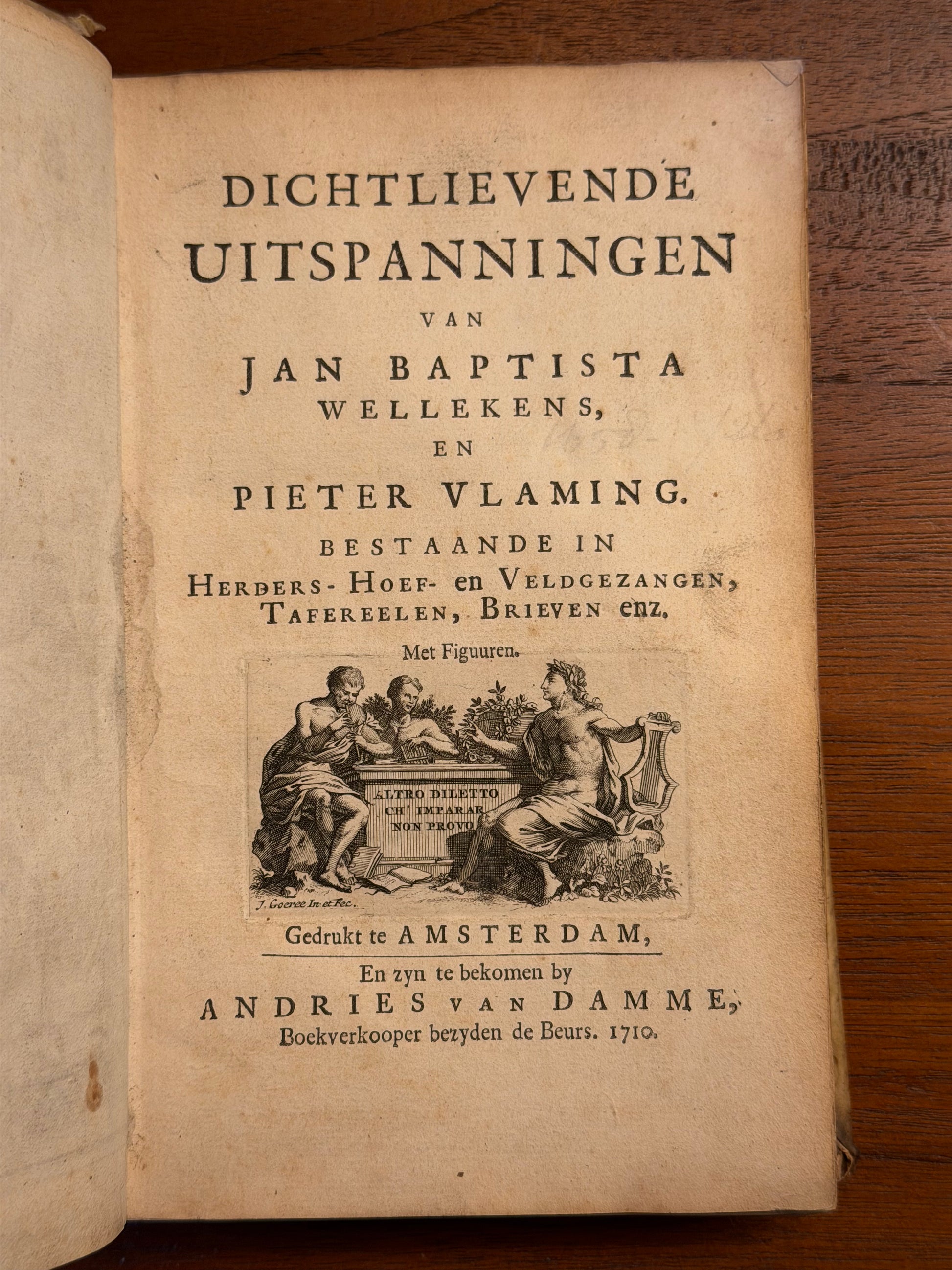 DICHTLIEVENDE UITSPANNINGEN VAN JAN BAPTISTA WELLEKENS, EN PIETER VLAMING. BESTAANDE IN HERDERS- HOEF- en VELDGEZANGEN, TAFEREELEN, BRIEVEN enz. 1710
