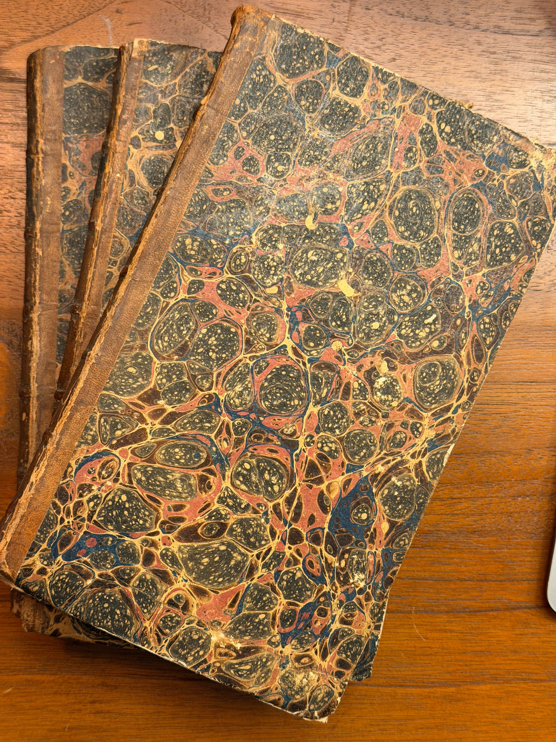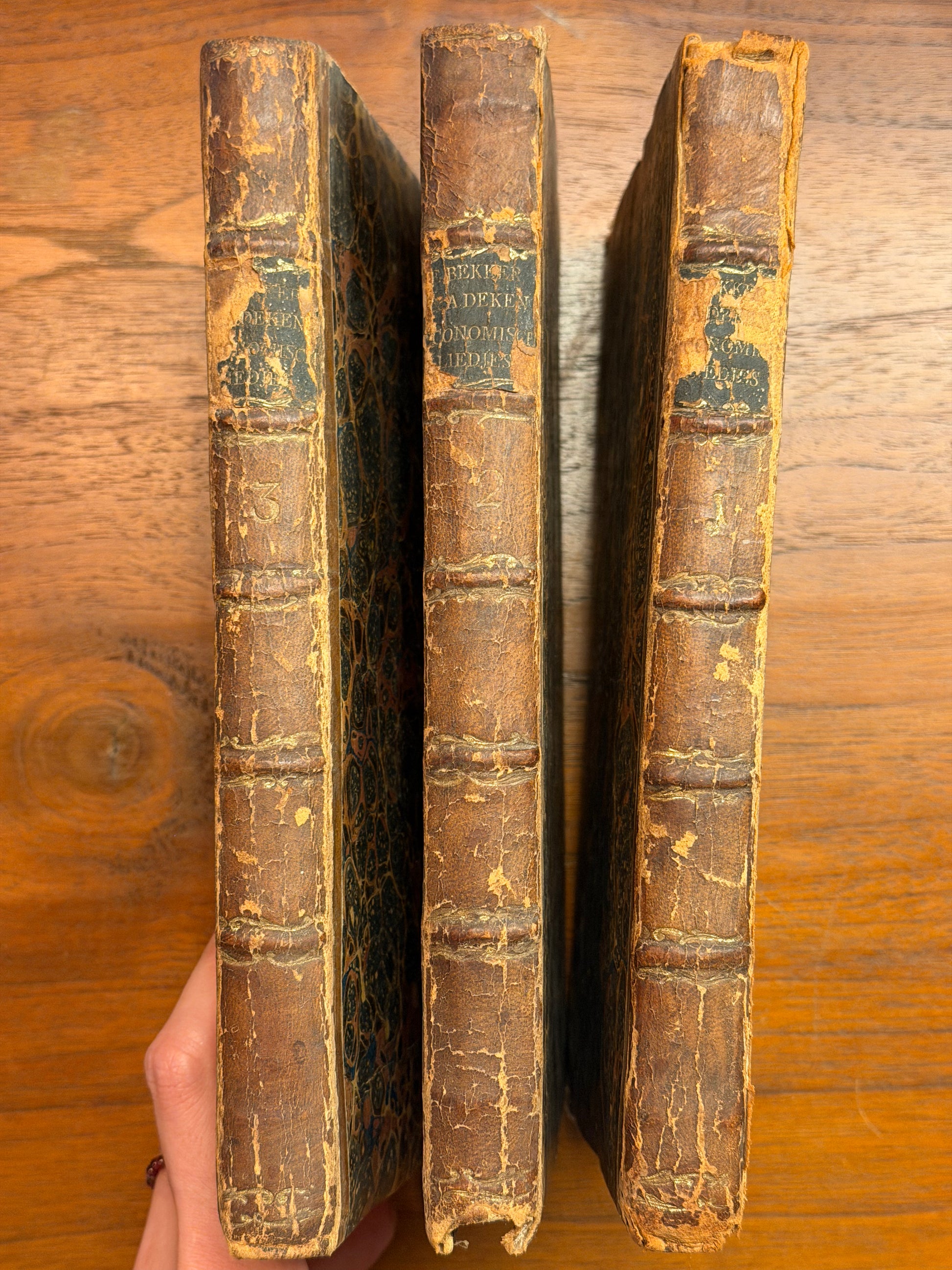 In drie delen. Halfleren band, rug en hoeken ietwat beschadigd maar verder in goede staat.