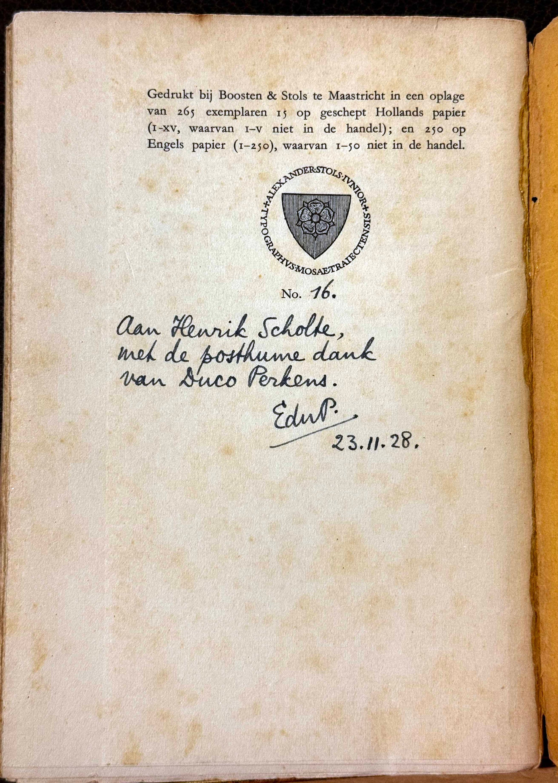 Gedrukt … in een oplage van 265 exemplaren … 250 op Engels papier (1-250) waarvan 1-50 niet in de handel. No 16: Met opdracht ‘Aan Henrik Scholte, met de posthume dank van Duco Perkens. E du P. 23.11.28