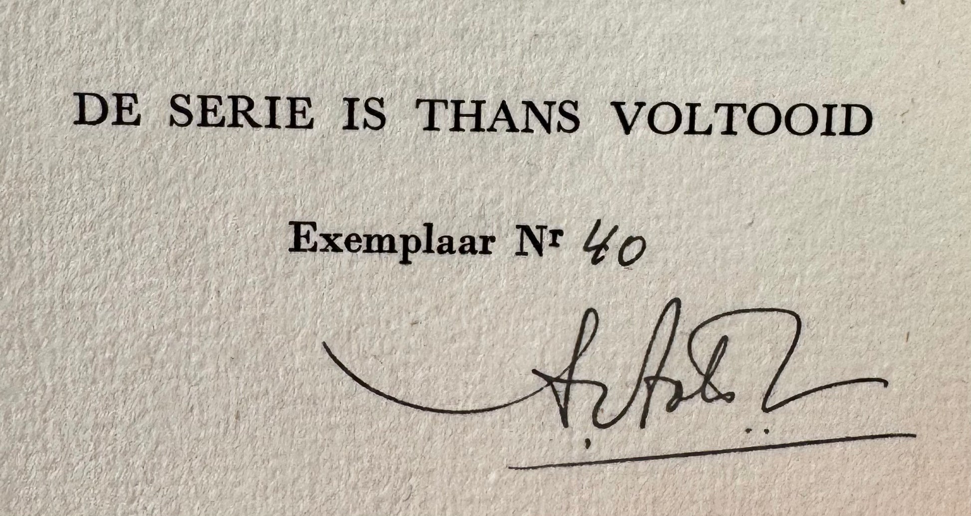 Oplage 50. Nr 40 gesigneerd door Stols, nr 46 en een ongenummerd exemplaar. In goede staat.