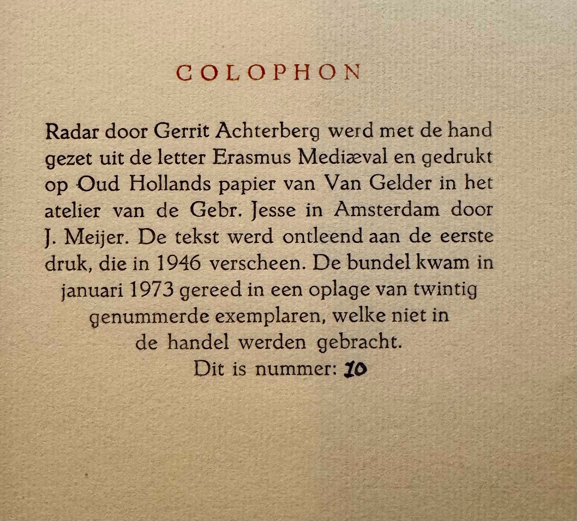 2de druk; Nr 10 van 20; op (getint) Oud Hollands papier van Van Gelder; Letter: Erasmus-Mediaeval; Druk: in lichtrood en zwart door J. Meijer [op de proefpers] in het atelier van de Gebr. Jesse; lichtgrijs papieren omslag met belettering in lichtrood en zwart. Als nieuw, niet opengesneden.