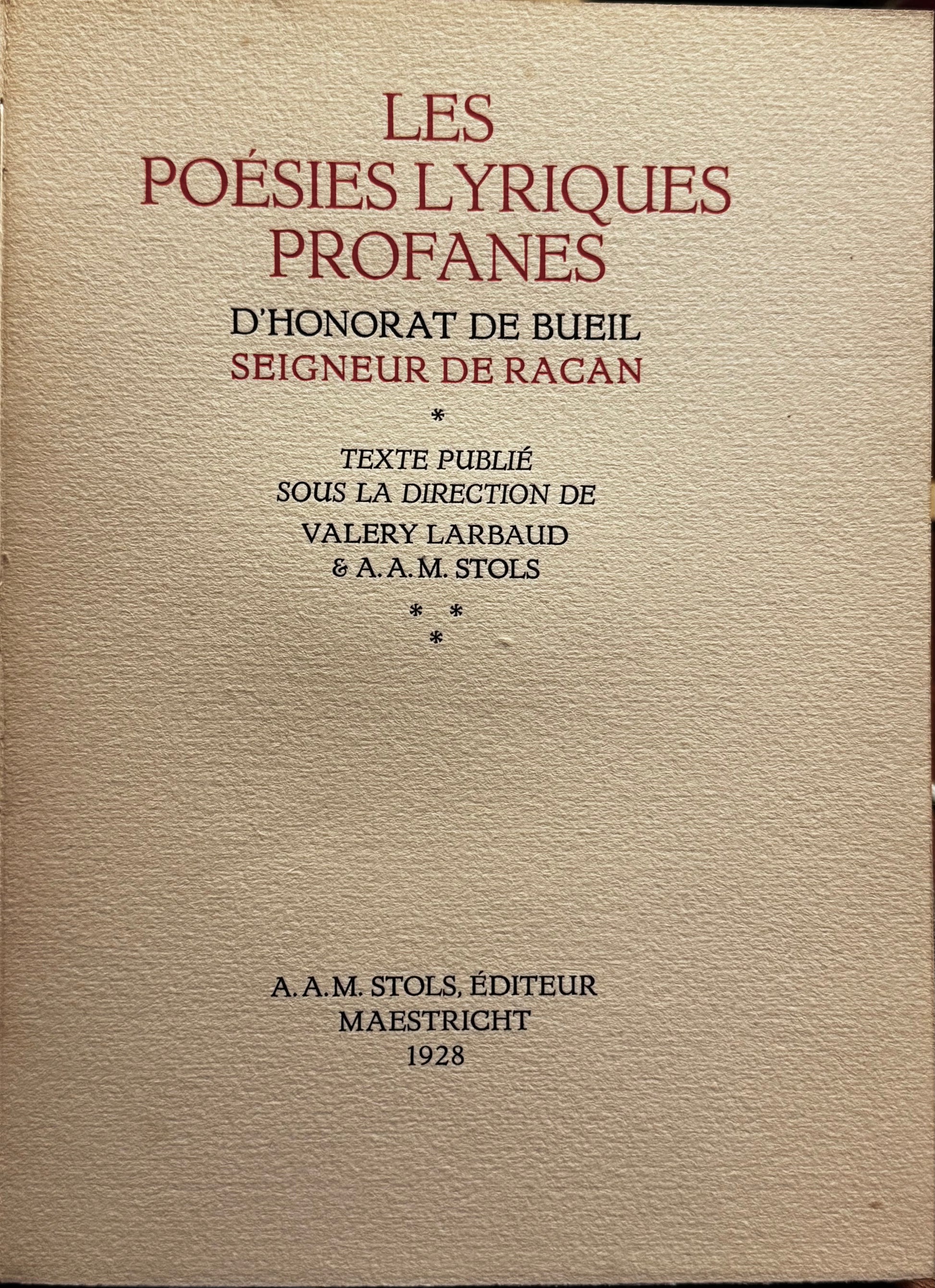 Honorat de Bueil, Seigneur de Racan, Les poésies lyriques profanes. Maastricht, A.A.M. Stols 1928