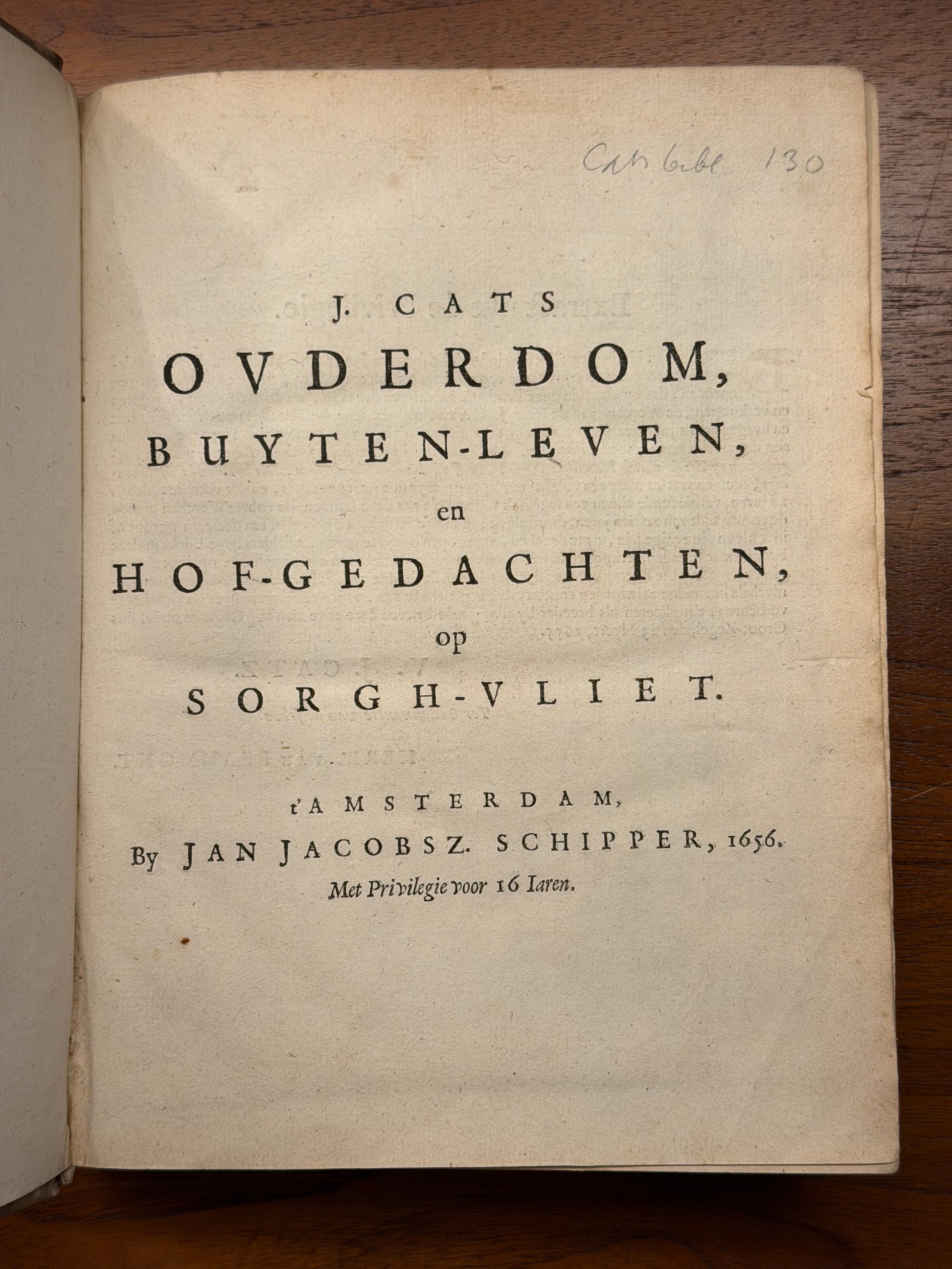 J. Cats, 1. Ouderdom, buyten-leven en hof-gedachten op Sorghvliet. Amsterdam, Jan Jacobsz. Schipper, 1656. 2. Koninklijke herderin Aspasia. Amsterdam, J. I. Schipper. 3. Afbeelding van 't huwelyck. Amsterdam, Jans Jacobsz. Schipper.