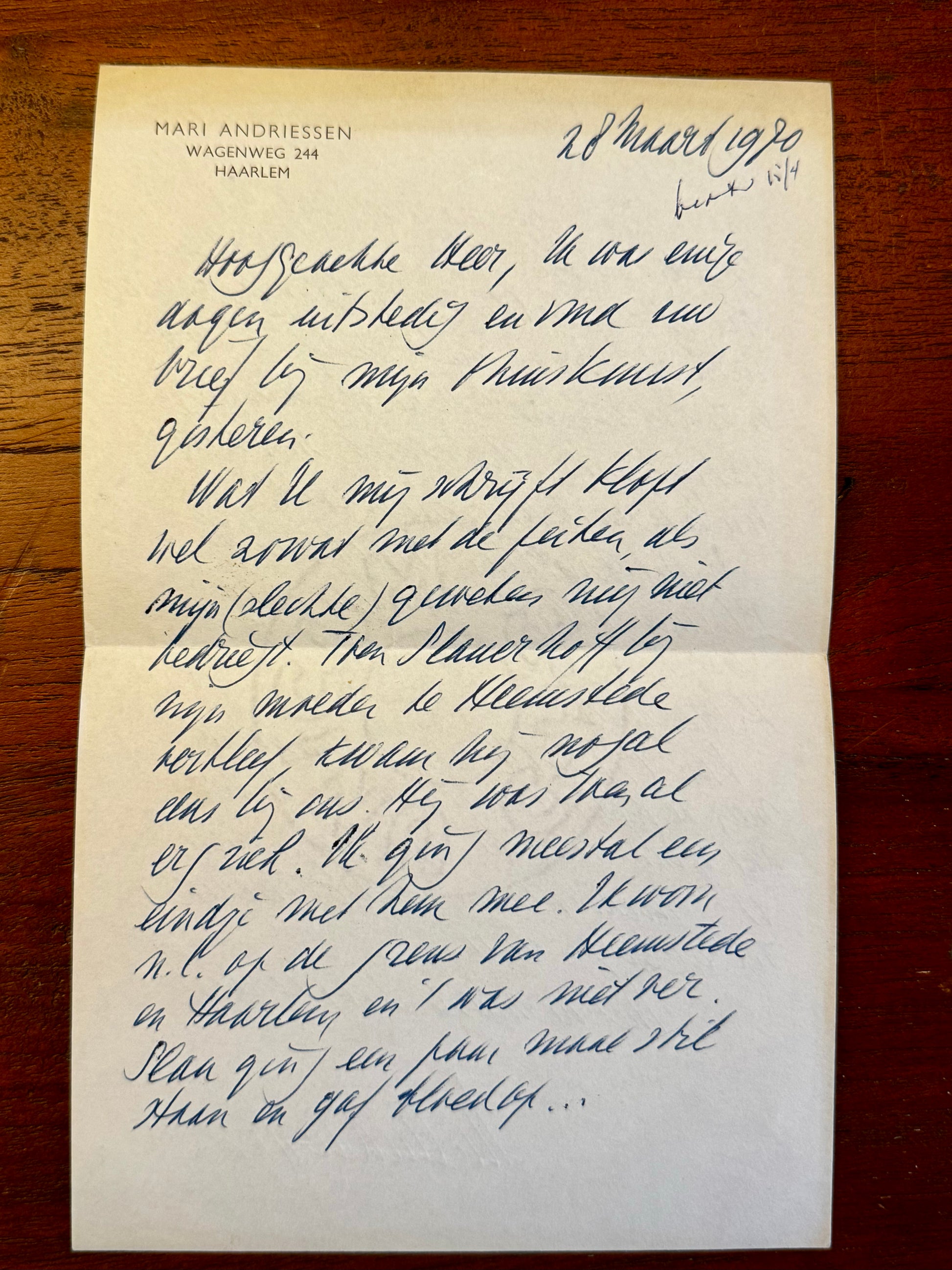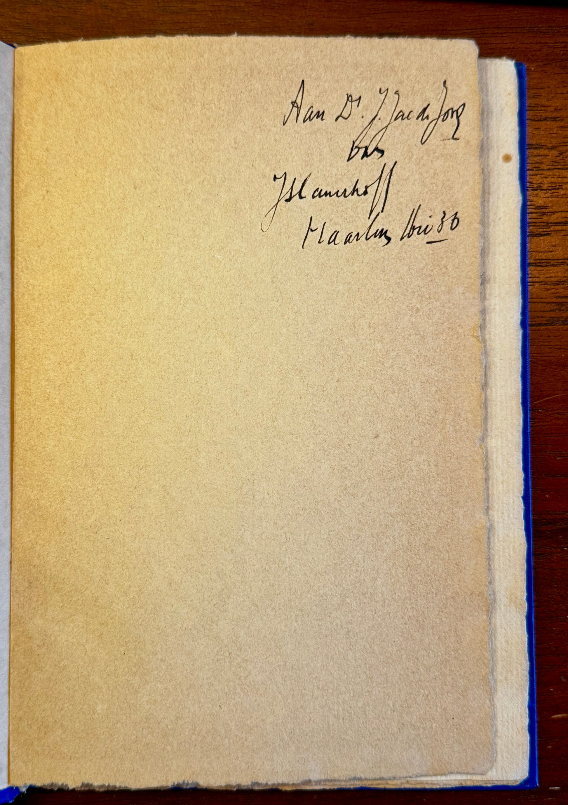 Niet genummerd exemplaar in harde blauwe band. Het achterplat wordt ontsierd door een breuk. De opdracht aan Dr. Jac. de Jong' Haarlem februari '36, zorgde voor verwarring, zoals blijkt uit de bijgevoegde correspondentie, waaronder brieven van de beeldhouwer Mari Andriessen en Kees Lekkerkerker