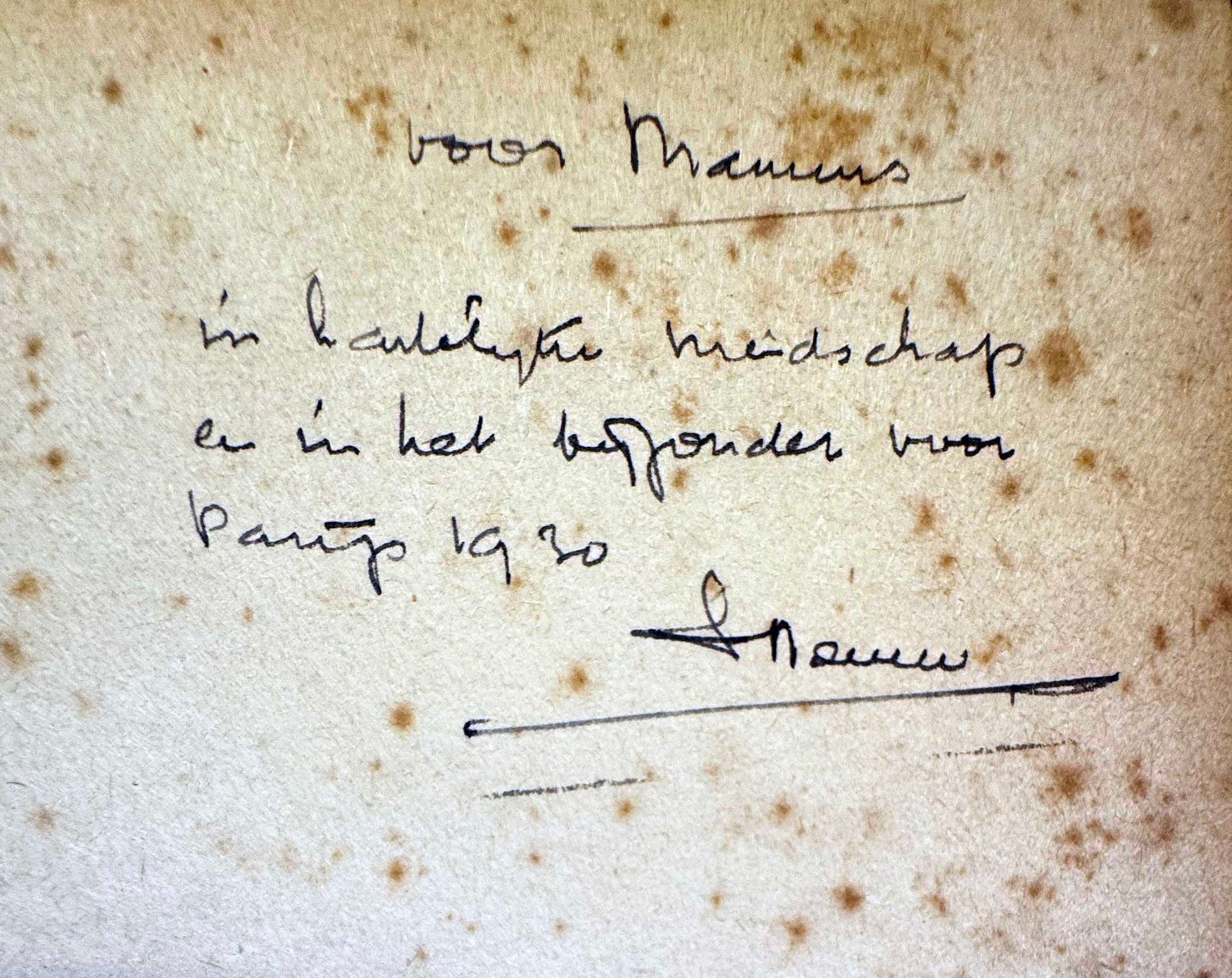 Met opdracht aan Mannus [Franken]. Papier heeft inmiddels ouderdomsvlekken, band goed
