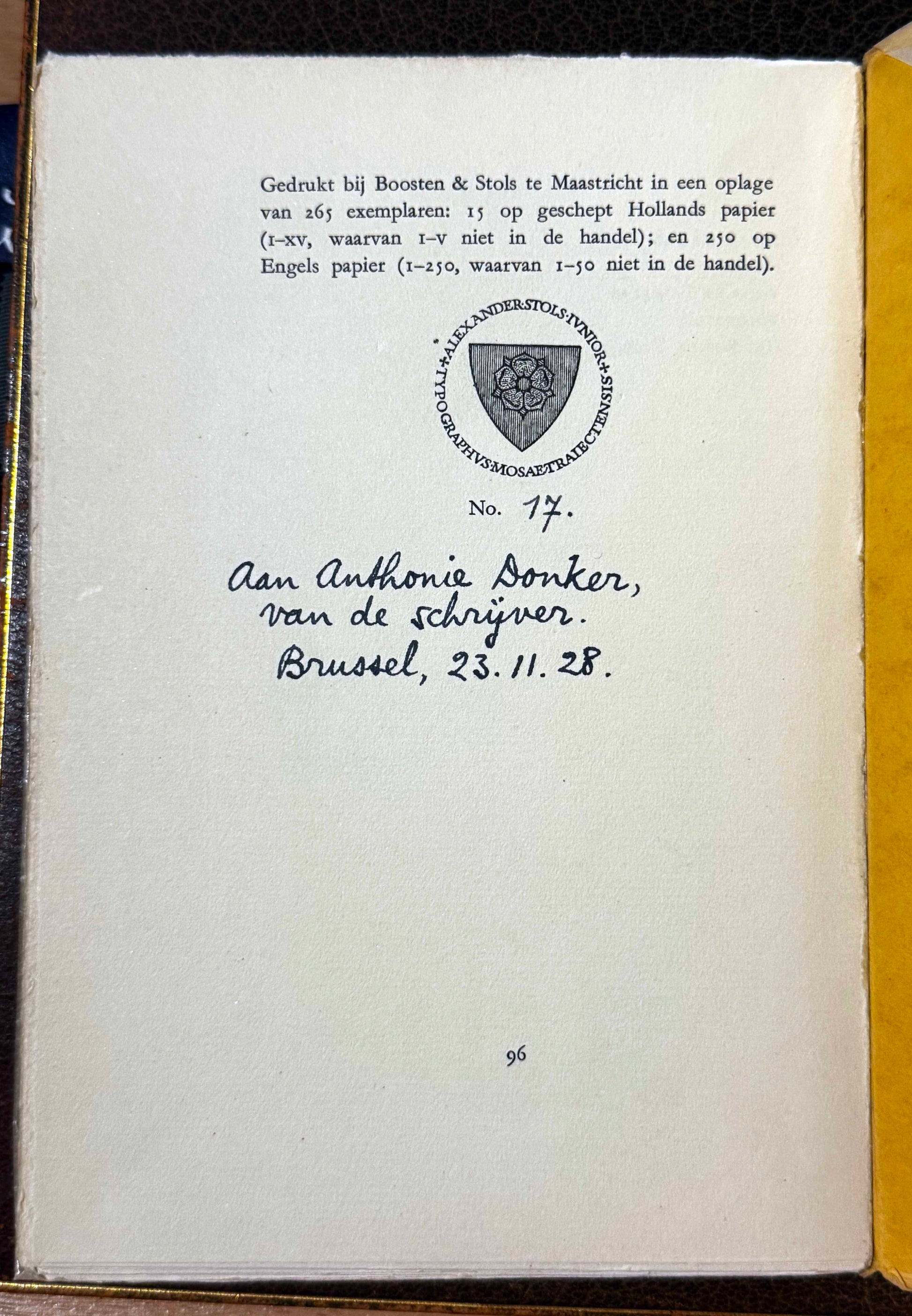 In honderd-twintig genummerde exemplaren, waarvan de eerste twintig buiten de handel. Papieren omslag.