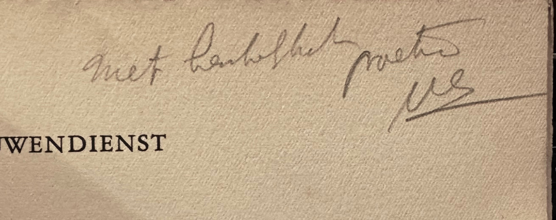Papieren omslag. Op frans titelblad in potlood 'Met hartelijke groet'