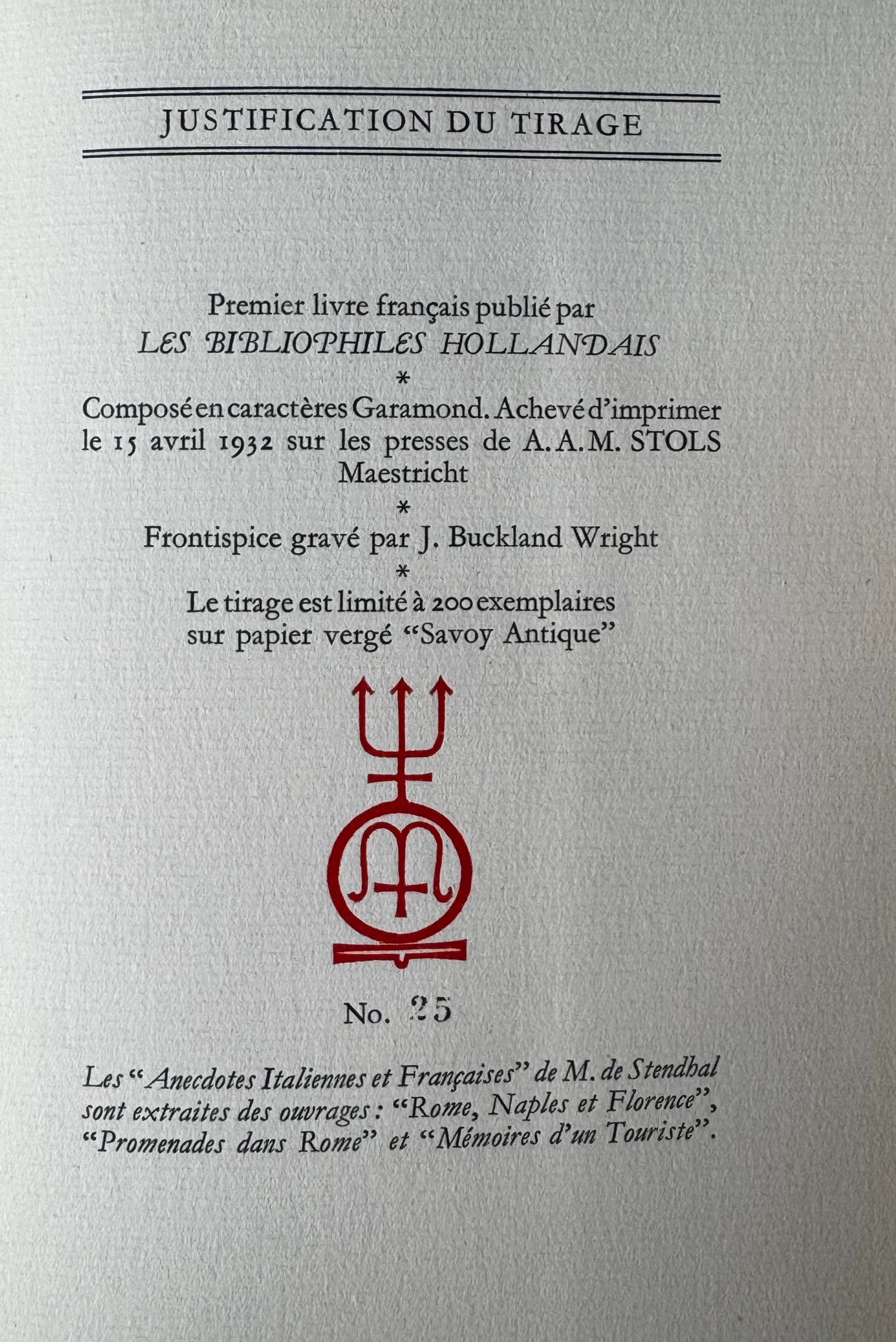 Stendhal, Anecdotes Italiennes & Françaises. Maastricht, A.A.M. Stols, 1932